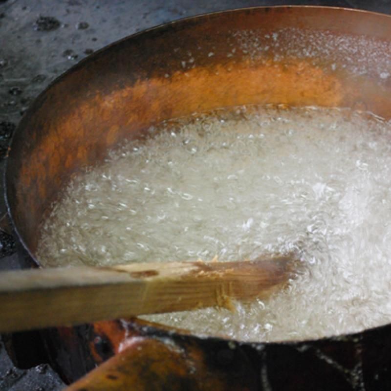 砂糖と水飴を釜に入れ、水分を飛ばしながら煮詰めます。