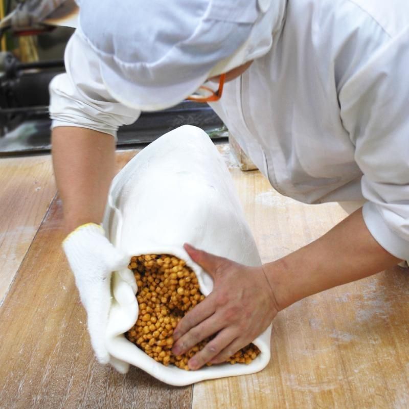 熱々の飴生地でかりんとうを包み、しっかりと塞ぎます。