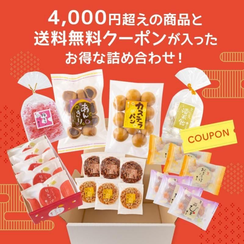 人気のお菓子を詰め込んだ特別な福箱♪ 福箱限定の商品も♪次回のお買い物に使える送料無料クーポン付き。